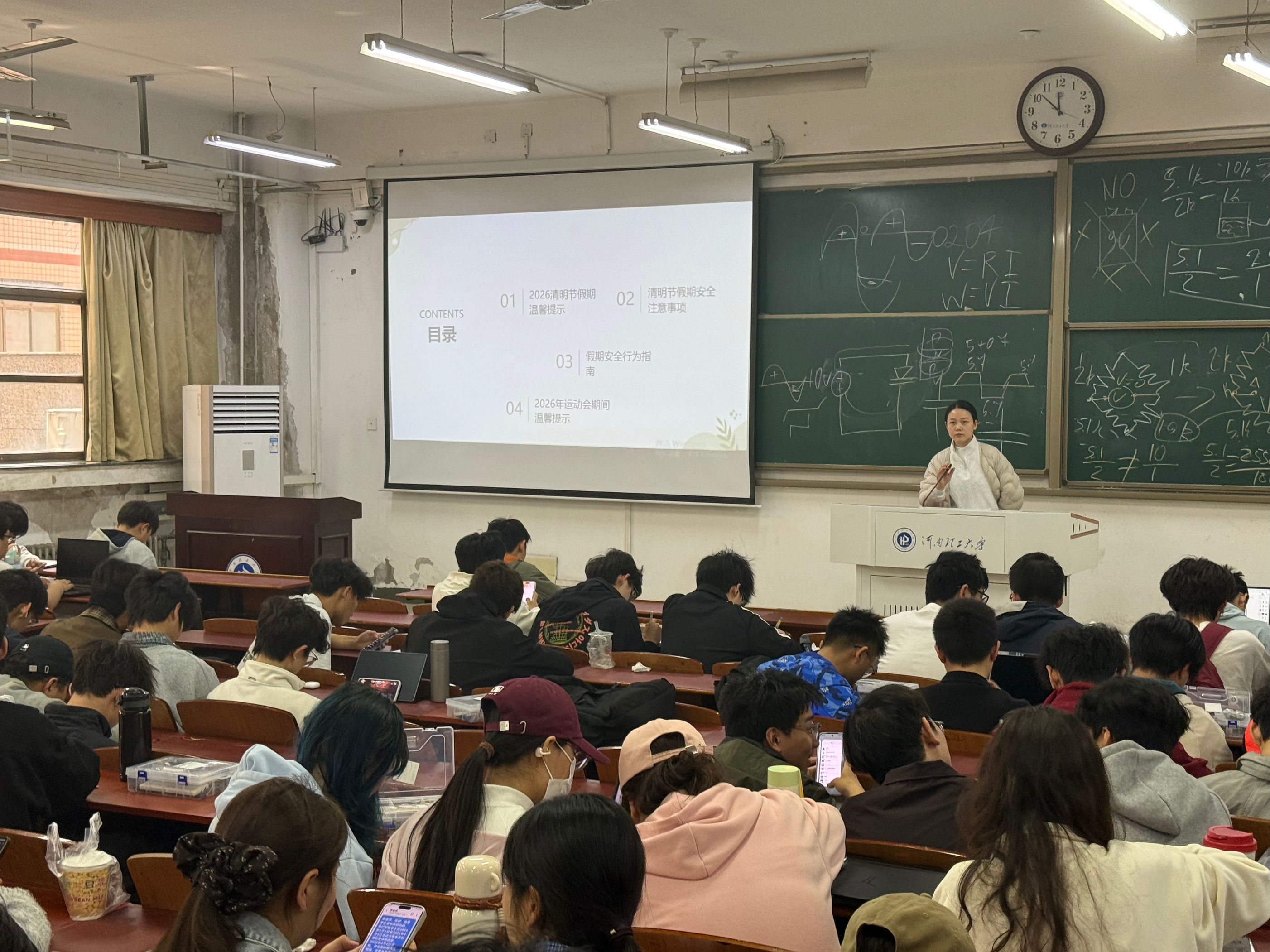 班会上,辅导员明确了清明节假期与学校运动会的日程安排,提醒同学们合理安排个人时间,严格遵守校纪校规。在安全教育方面,班会着重强调了以下注意事项:一是清明节期间出行安全,包括交通安全、人身财产安全、文明祭扫等;二是运动会期间的运动安全,包括赛前热身、赛中防护、身体状况监测、务必购买保险等;三是校园日常安全,包括宿舍用电、防火防盗、网络安全及防范电信诈骗等。班会还特别提醒学生保持通讯畅通,注意饮食卫生,合理安排作息。